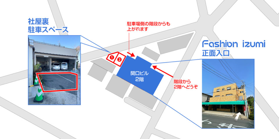 また、Googleマップをご利用の方は「ファッションいずみ」で検索していただくと、スムーズにルート案内をご利用いただけます。