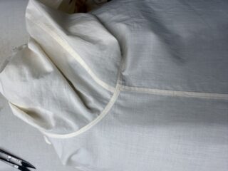 透け感を活かすため、衿やカフスは芯地を使わず「共生地」を挟んで縫い上げました。