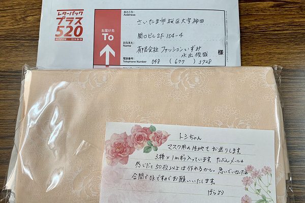 そして、また作ってと頼まれてレターパックで生地が届きました。