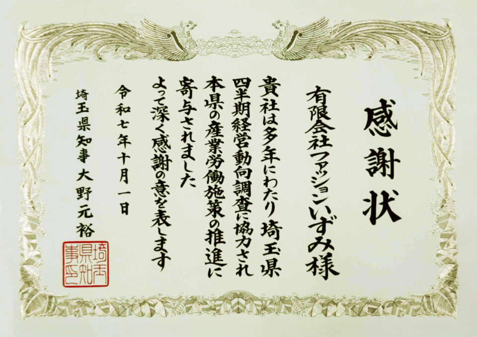 埼玉県「経営動向調査」協力に対し感謝状をいただきました